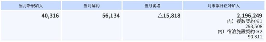 なお加入件数には、同一契約者の2契約目・3契約目の割引(通常月額2,530円(税込)を990円(税込)に割引)の適用分、宿泊施設客室向け契約の累計正味加入件(室)数、トリプルプラン(月額3,960円(税込)/年額43,560円(税込))の契約者(1契約として計上)も含まれるとしています。