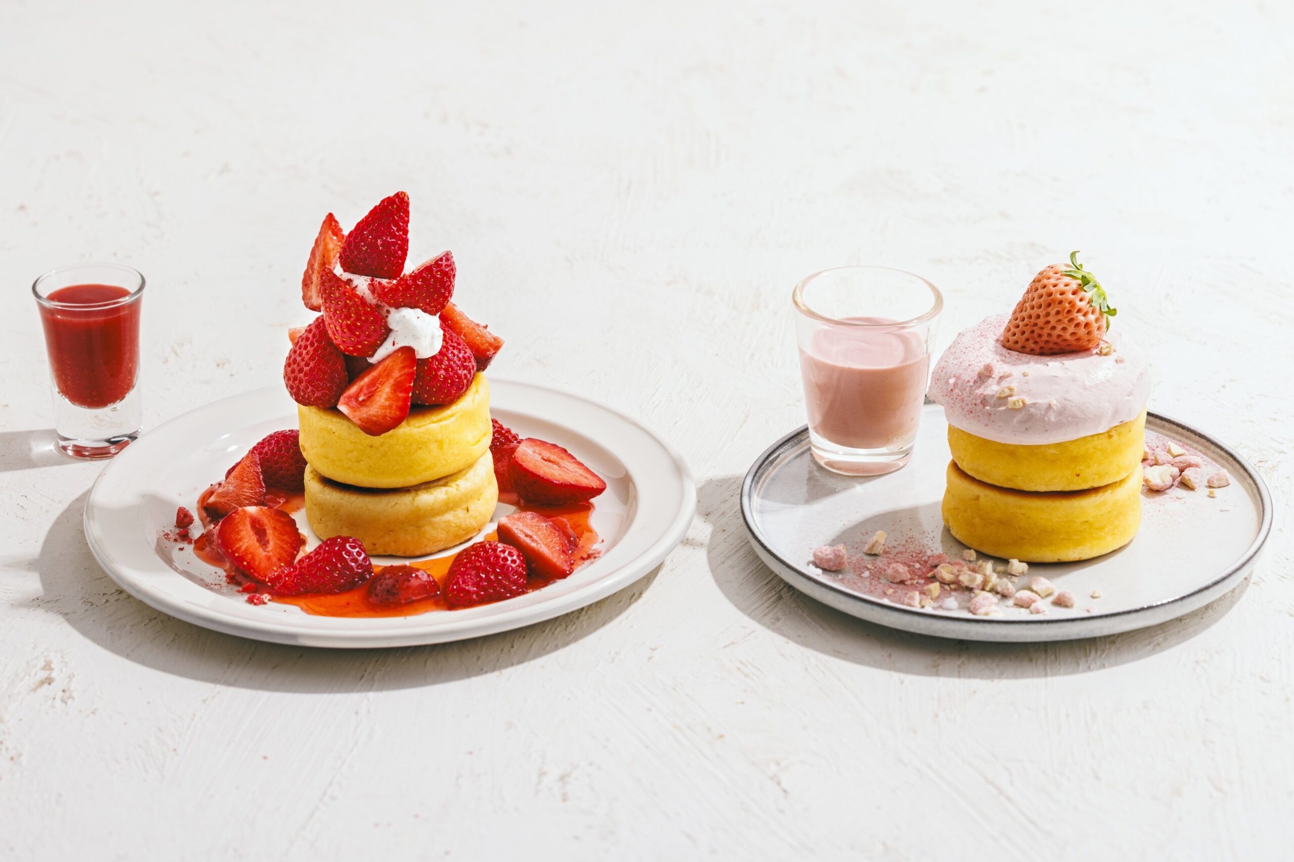 提供するのは「淡雪 ビスケットパンケーキ」(1,800円/税込1,980円)と「あまおう ビスケットパンケーキ」(2,700円/税込2,970円)、新作の「いちごミルクドーナツ」(620円/税込682円)です。淡雪は白みがかった果皮が特徴の苺で、あまおうは甘みと粒の大きさで知られる品種です。
