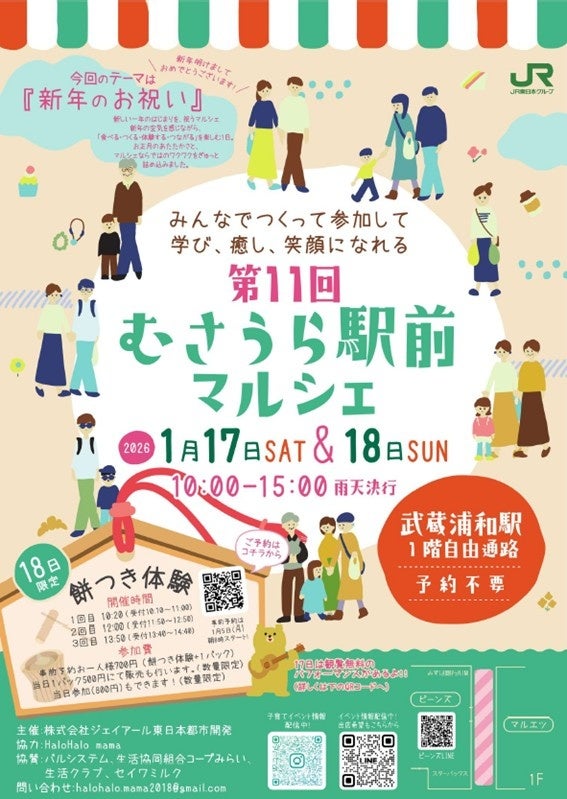 JR武蔵浦和駅前で2026年1月17日(土)・18日(日)の2日間、「第11回むさうら駅前マルシェ」が開かれます。テーマは「新年のお祝い」で、地域で活動する「HaloHalo mama」と連携し、株式会社ジェイアール東日本都市開発が運営します。会場ではキッチンカーが出店するほか、パフォーマンスやワークショップなど体験型の企画を展開します。さらに18日(日)限定で餅つき体験を実施し、“つきたて餅”の販売も行います。駅前での開催により立ち寄りやすさを生かし、家族や友人と新年らしい雰囲気を楽しめる場として集客を図ります。今後は、内容の拡充や継続開催を通じて地域のにぎわい創出につながるかが注目されます。